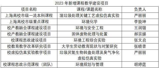 过去一年中,环境工程系多次召开专业教师例会就培养计划、课程大纲、教学方法等展开讨论,鼓励教师积极参与课程建设培训并申报课程建设项目。在公司的指导和支持下,环境工程系2023年度课程建设项目立项取得良好成绩,新增1门上海高校市级一流本科课程,1门上海高校市级重点课程,5项校级教学建设项目,1个校级课程思政示范团队。