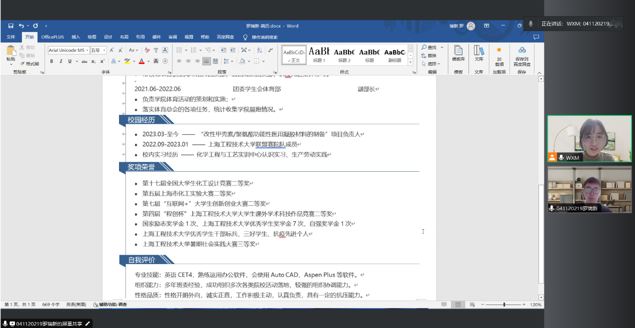 毕业班辅导员开展线上简历一对一指导,从简历版式、内容主次、细节调整等方面着手,提出简历修改意见,讲解简历设计的注意事项和方式方法,强调简历以一页为宜,突出重点、格式美观,内容需根据求职意向及时调整。