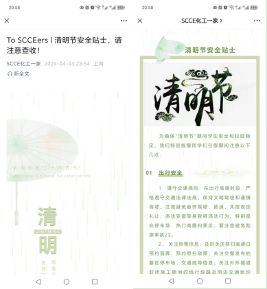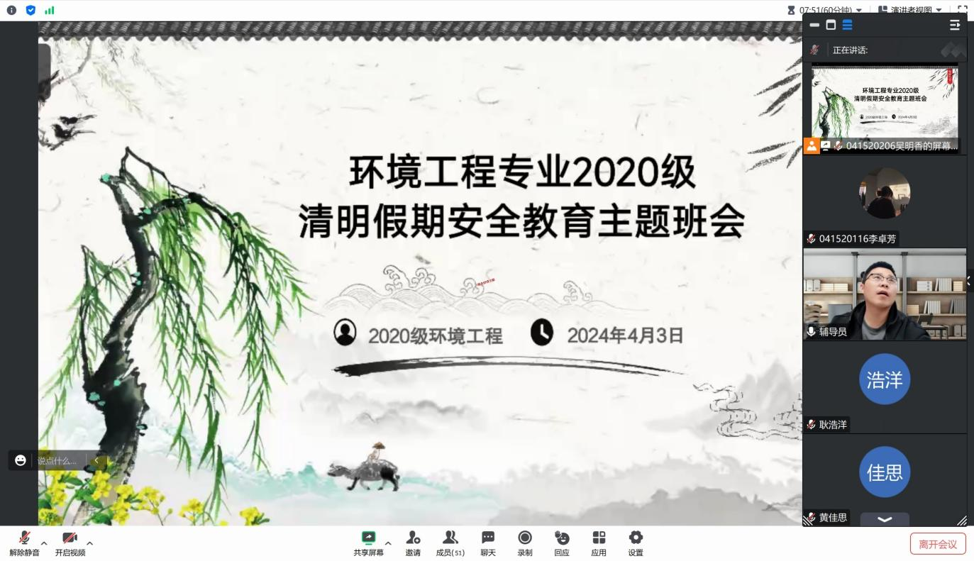 四月清明草长莺飞,踏青赏景安全先行。为提高广大同学假期出行的安全意识,增强安全防范能力,4月3日,公司各系辅导员、班主任分别召开了“清明假期安全主题教育”班会。化学工程与工艺专业辅导员王小萌要求同学们假期出行要注意交通安全,遵守交通规则,不要随意闯红灯、逆行或超速行驶,做到文明出行、安全出行。高分子材料与药物化学辅导员王一凡提醒同学们外出游玩要注意饮食卫生,选择卫生条件良好的餐馆用餐,不食用过期、变质或来源不明的食品,避免食物中毒。环境工程专业班主任郝宗娣在主题班会上提醒同学们清明假期参加祭扫活动要文明祭扫、注意防火,结伴出行、谨防溺水等。研究生辅导员邓月在班会上强调假期留校学习、做实验的同学要把实验室安全放在首要位置。公司团委还推出了“清明节安全贴士,请注意查收!”专题推文,向同学们宣传假期安全注意事项。