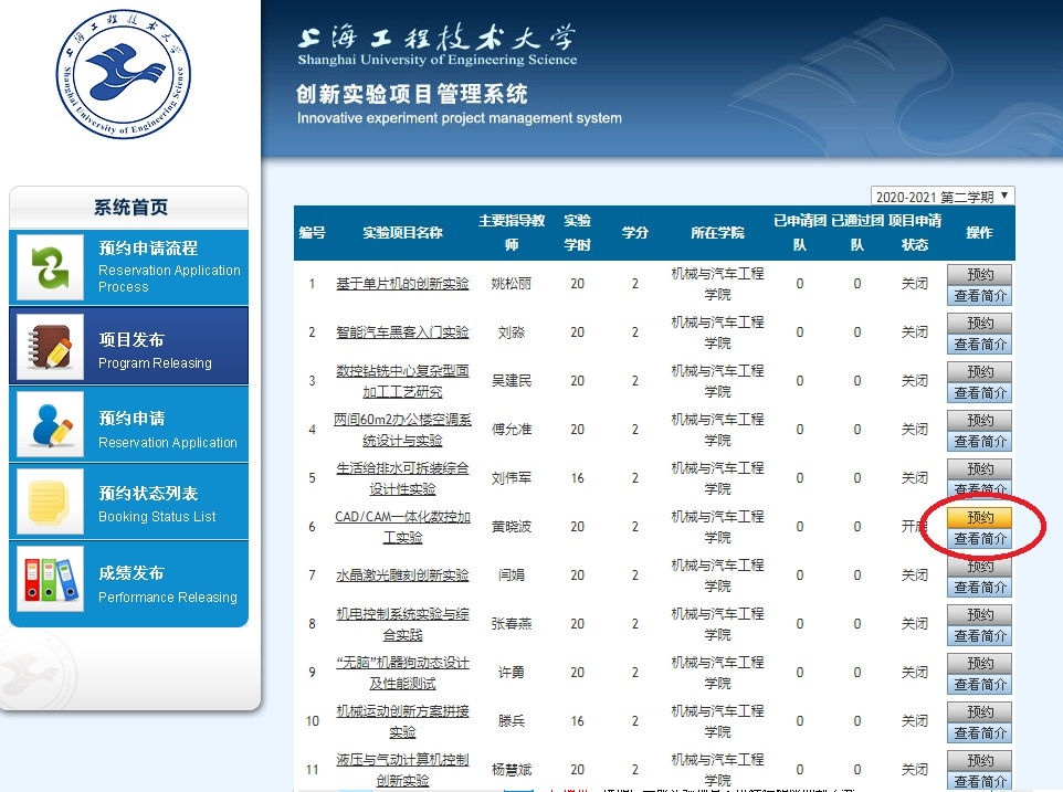 网站地址:http://cxsyyy.sues.edu.cn,也可从集团首页下方的“教学资源服务站点”中快速链接,初始密码为6个“1”。先查看预约申请流程,再选择实验项目,以团队为单位进行申请预约,具体操作由队长一人完成。