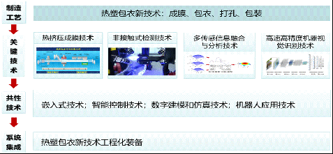 该技术主要包括药浆输送成型、干燥、在线监测、热压、分切、塑膜输送等工艺,同时通过识别系统完成次品剔除和正品的包装,是集传输、识别、控制和材料物性于一体的多功能集成(技术路线见图7)。该方向拟通过高精度视觉成像检测技术、及其视觉识别技术、多级联动柔性输送技术、热封切控制技术的系统集成,结合智能控制系统开发,推动膜剂成套装备迭代升级,实现高水平智能装备,替代国外进口装备。