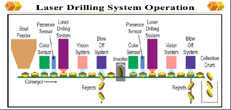 1)渗透泵控释片产业化的关键装备之一是激光打孔剂。渗透泵控释片剂已成为目前最理想的口服控释药物制剂,释药机理见图1。激光打孔机运行原理如图2