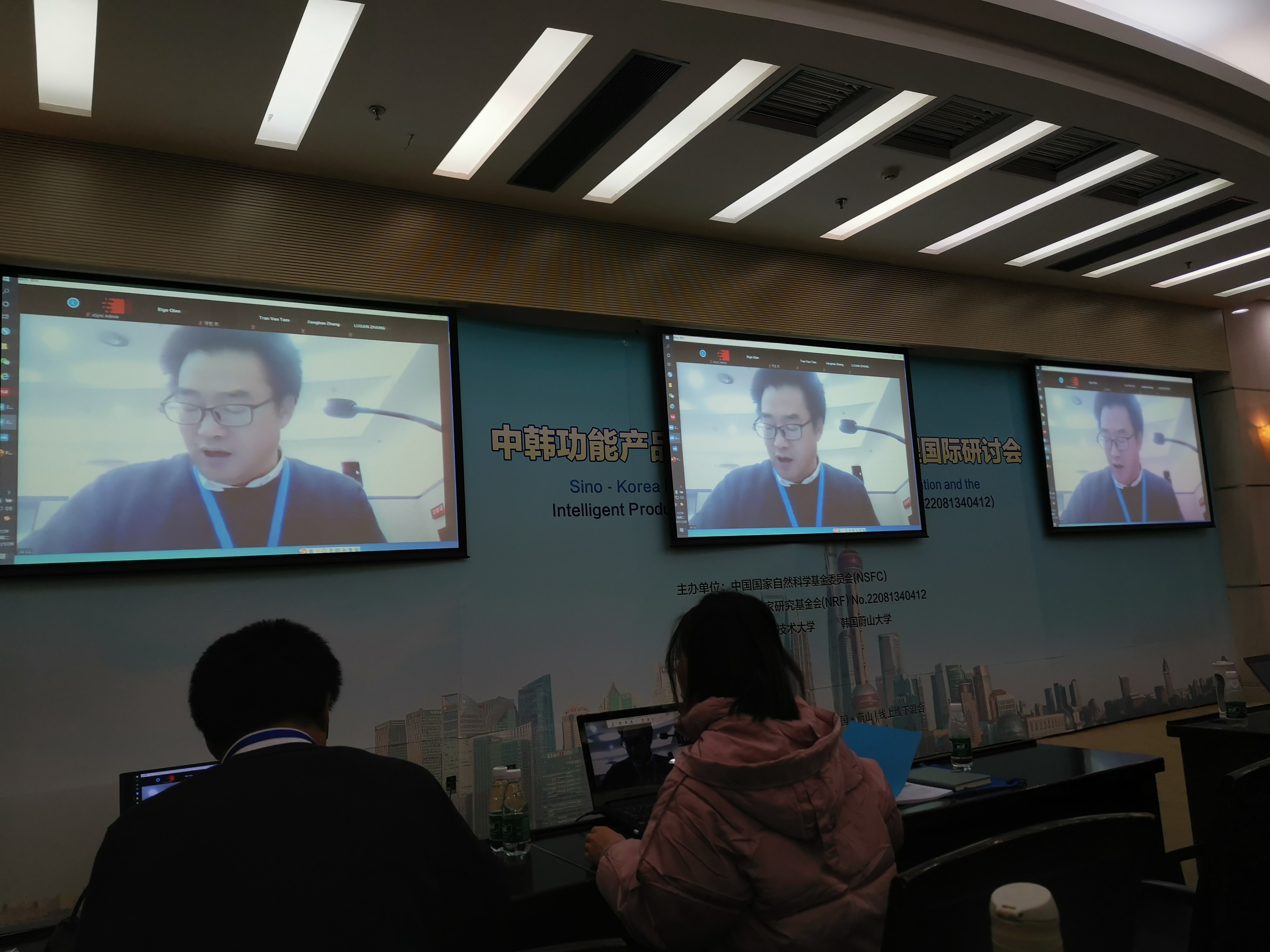 因国内外新冠肺炎疫情防控形势,为保证常态化疫情防控措施落地见效,本次研讨会采用线上线下混合模式,中方与韩方各设主会场和分会场,各会场间采用视频连线。主、分会场的与会人员佩戴代表证、口罩,出示身份证、健康码,配合体温检测,做好个人防护,保持社交距离。