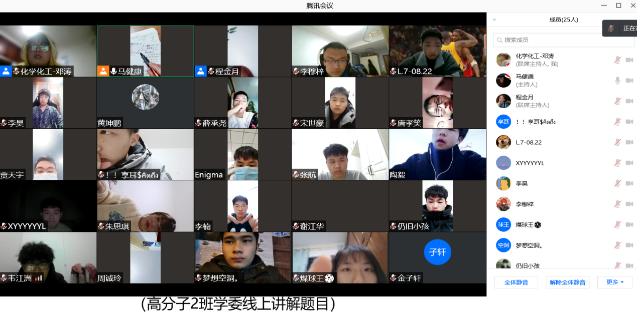 为了培养同学们良好的学习习惯,提升同学们的自主学习能力,威廉希尔官网20级高分子2班自1月22日起在辅导员郑文静老师的带领下开展“居家抗疫 集体学习”线上活动。