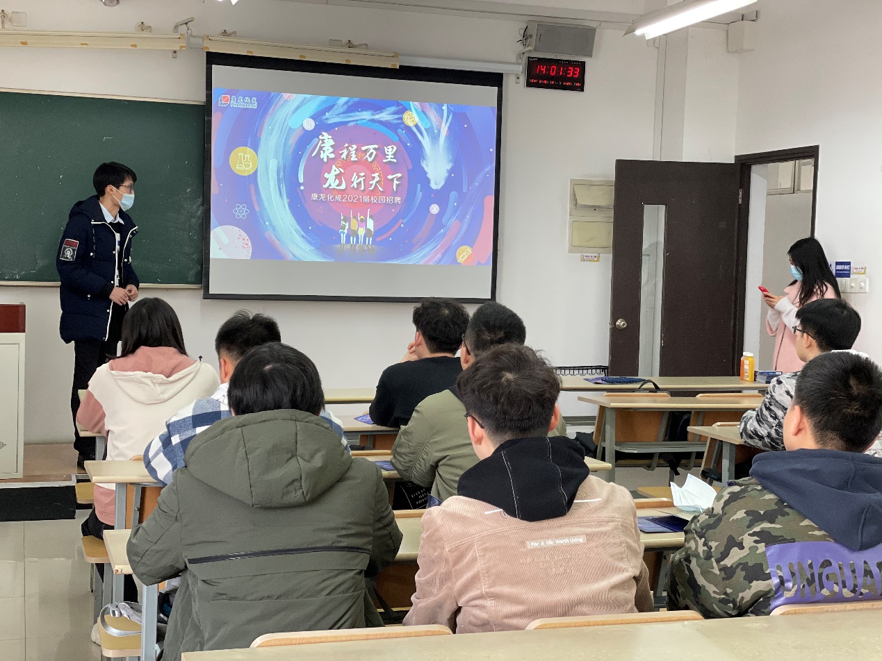 3月10日下午两点,康龙化成新药技术股份有限公司在公司教学楼C406开展2021年春季校园招聘宣讲会,公司人事负责人丁家琪作为主讲人主持本次招聘会。