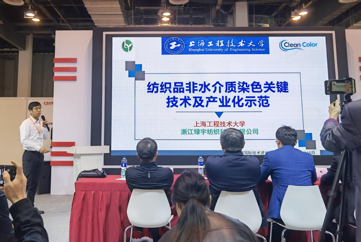 在上海教委科发中心和各高校举办的“创智汇”路演活动中,公司纺织化学清洁生产工程技术研究中心副主任裴刘军展示了与海宁绿宇纺织科技有限公司合作开发的适用于棉花的非水介质染色系统和相应的介质回收系统,其团队将具有介质功能即物质输送和能量传导功能的水,用一种既不能溶解染料也不能和水相溶的非极性溶剂来替代,实现了活性染料在无盐条件下98%以上的上染率,固色率从65%提高到90%以上,实现了节水95%以上,达到污水零排放目标。