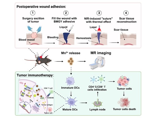为满足肿瘤术后多重管理需求,避免肿瘤复发,团队开发了锰基免疫调节生物胶(BSA-MnO2-京尼平-Ca-Y)。京尼平与BSA及皮肤组织中的氨基交联,经光热升温实现伤口粘合,并有助于减少皮肤疤痕,改善美观效果;加入Ca-Y沸石,实现止血功能;同时,生物胶的光热效应杀灭残余肿瘤细胞,并将其转化为内源性免疫抗原,结合释放的锰离子激活STING通路,增强抗肿瘤免疫原性,避免肿瘤复发。利用锰的磁共振成像能力,实现生物胶分布和降解的实时监测。除Ca-Y沸石外,该生物胶作为平台,可装载药物及其他活性物质,提升生物胶的功能。总之,该生物胶满足了肿瘤术后伤口粘合、止血、残留肿瘤消融和免疫激活、抑制肿瘤复发的多重临床需求。本研究为肿瘤术后管理提供了全面解决方案,并为个性化免疫治疗提供新的手段。