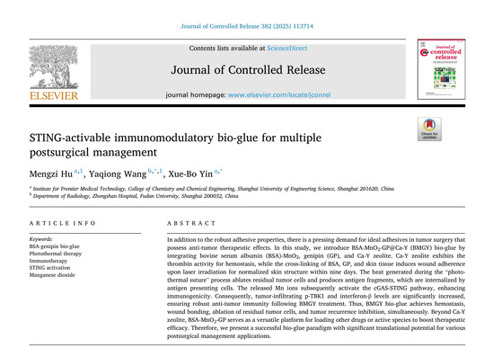 近日,威廉希尔官网尹学博教授指导硕士研究生胡梦姿在学术期刊《Journal of Controlled Release》(中科院一区Top,影响因子10.5)上发表题为“STING-activable immunomodulatory bio-glue for multiple postsurgical management”的研究论文。尹学博教授为通讯作者,胡梦姿为第一作者,复旦大学附属中山医院放射科主治医师王雅琼为共同第一作者和共同通讯作者,威廉希尔官网为第一单位和通讯单位。