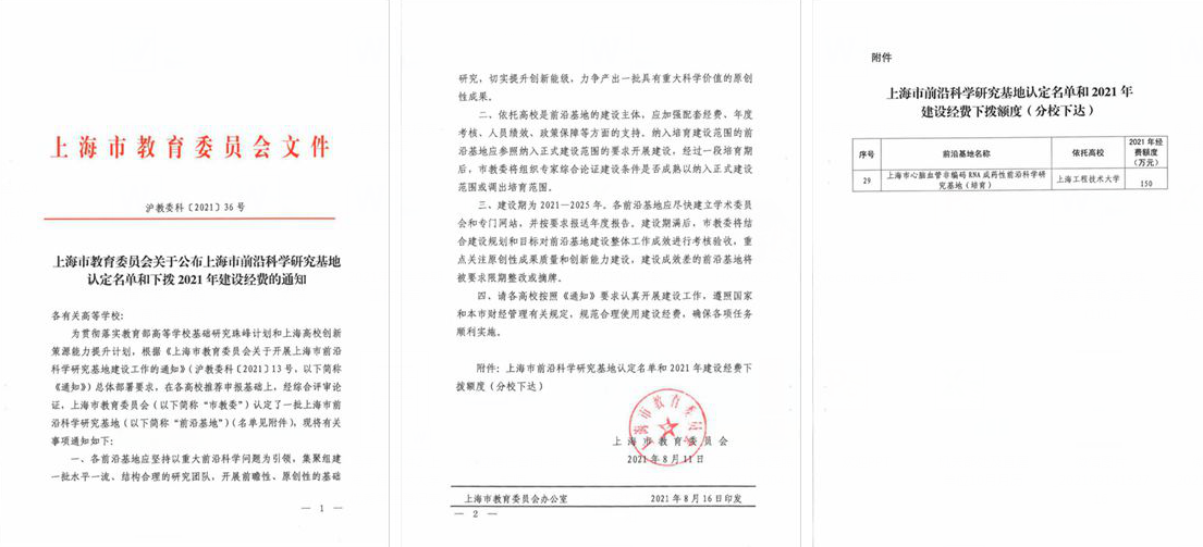 近日,上海市教委公布了前沿科学研究基地认定名单,公司威廉希尔官网牵头申报的上海市心脑血管非编码RNA成药性前沿科学研究基地(培育)获批立项,建设周期为2021-2025年。