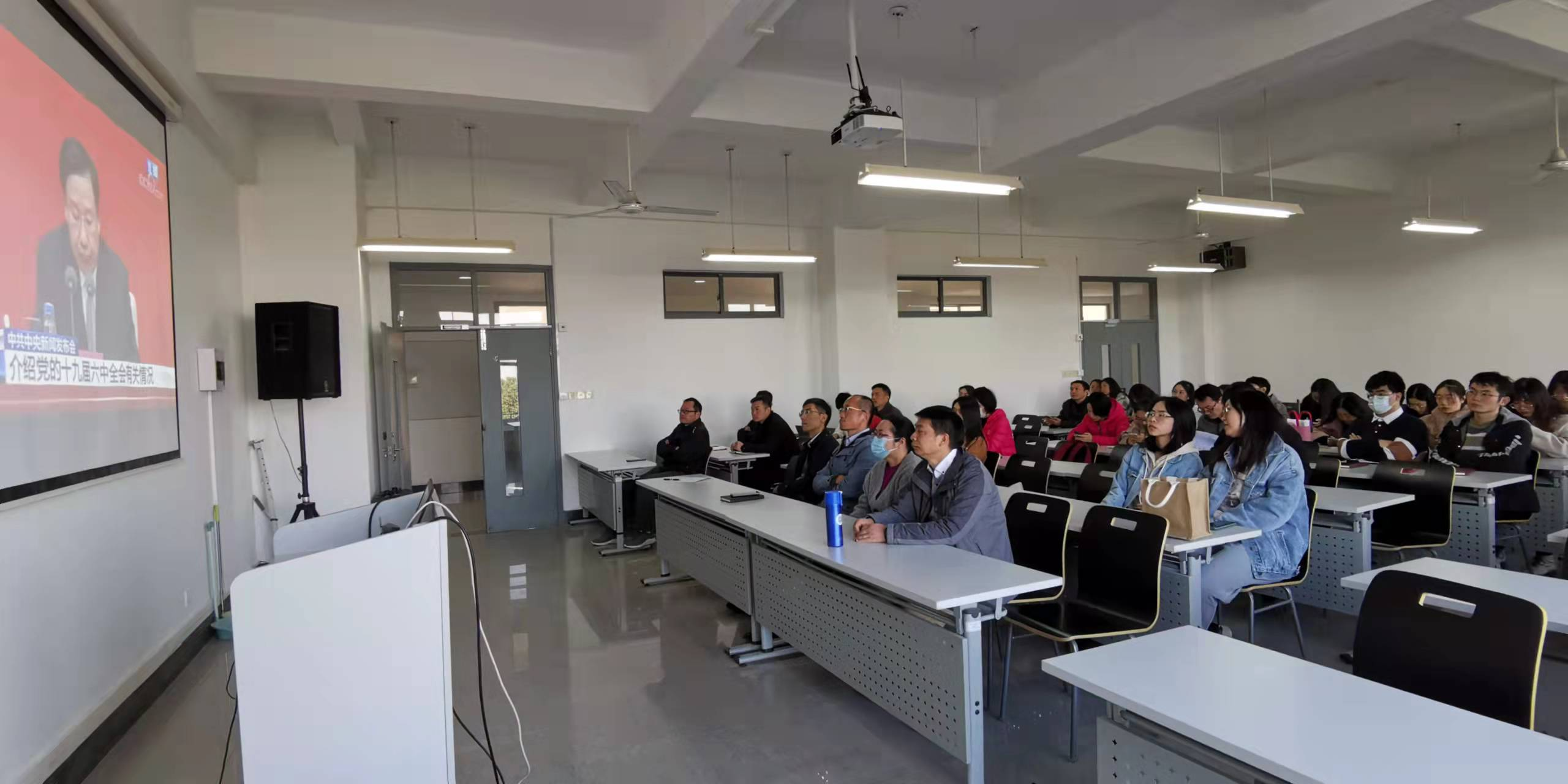 在新闻发布会上,师生们认真聆听了中共中央宣传部分管日常工作的王晓晖副部长关于中共十九届六中全会和《决议》的重要内容和主要特点的介绍,以及中央政策研究室主任江金权先生、中央财经委员会办公室分管日常工作的副主任韩文秀先生、中央党史和文献研究院经理曲青山先生等对与会国内外媒体记者提问的回答。