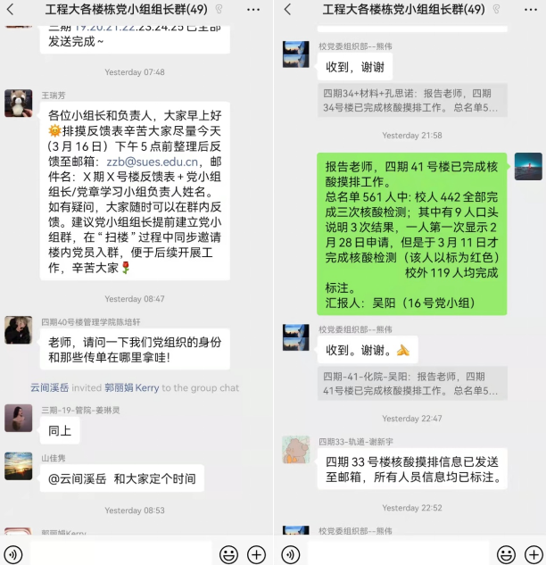 鼓励员工党员参与抗疫志愿服务。研究生党支部在园区成立党员抗疫志愿先锋队,按照公司疫情防控工作相关要求,承担了传递疫情防控信息、协助组织核酸检测、代购日常生活用品、分发一日三餐食品和代取快递代收垃圾等工作,发挥了党员先锋模范作用及党支部的战斗堡垒作用。在“足不出户”的抗疫倡议下,本科生党支部在楼栋成立了临时党小组,员工党员积极行动,配合公司开展数据统计、核酸检测等相关工作,助力疫情防控。