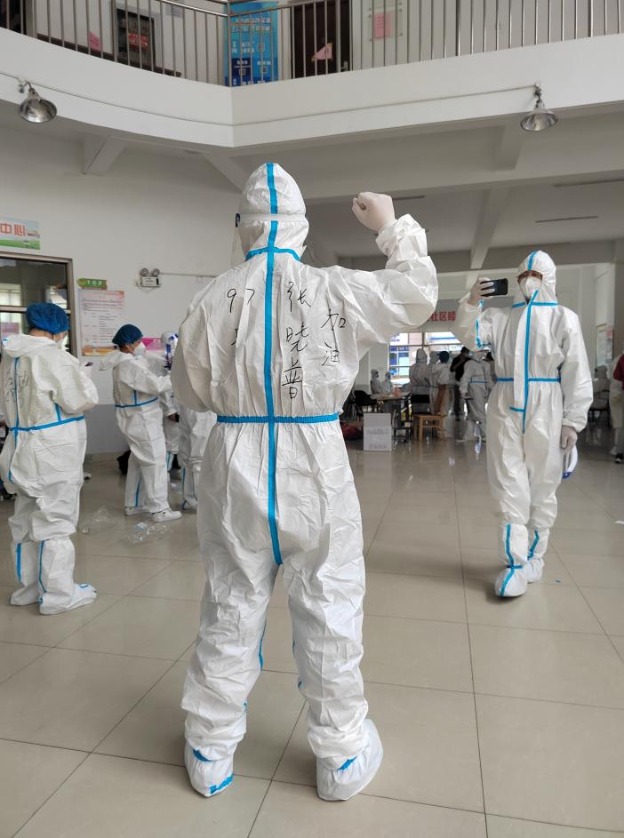 (2)员工采样队伍的监测员。隔离健康观察期满当天,他就承担了员工核酸采样进展的实时监测员,从第一位员工到监测点开始采样到当天最后一位同学采样结束,监测检测队伍行进实况、维持检测队伍有序进场、提醒员工前后保持距离,他在宿舍到操场的路上一站就是一个下午。