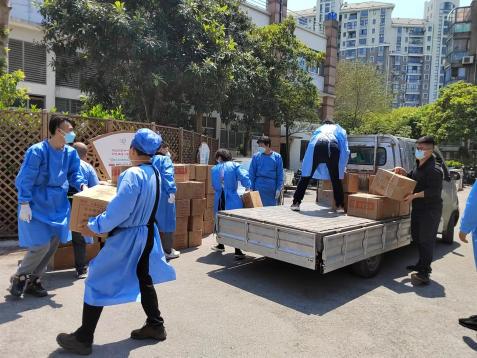 (3)爱心捐赠物资的分发员。员工日常生活用品、用餐食品、防疫物品数量大、品种多,为了能够及时、精确的将相关物品发放到每一个员工手中,张晓普老师根据公司网格化管理区域、男女生人员数量、员工家庭经济状况等制定了不同的分发方案,和志愿者一起将一箱箱物资转运到分发地点,有序发放。