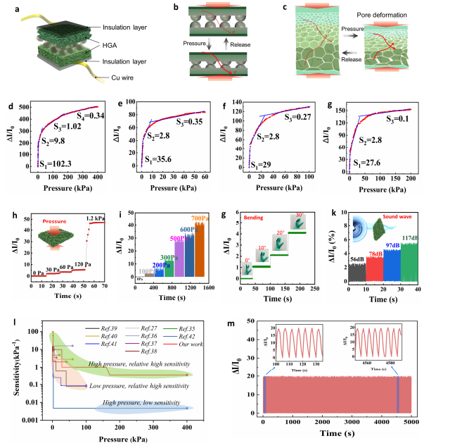 通常而言,压力传感器在压力作用下电阻、电流或电容的变化大小是直接影响其灵敏度的一个关键因素。然而,用于制造压力传感器的软材料或多孔聚合物是不可压缩或有限可压缩的,因此压力工作范围和灵敏度提高有限。在本研究中,作者在一个传感器中同时引入分层和梯度多孔结构,这种结构使传感器在宽压力范围内(0~400 kPa)产生压缩形变;另外,在其表面引入半球微孔结构,使得传感器在低应力下具有高的灵敏度且有助于其在较宽压力范围下灵敏度的提高。