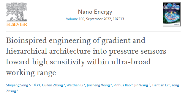 近期,公司威廉希尔官网宋仕强副教授在柔性可穿戴设备领域取得重要研究成果,相关研究以“Bioinspired Engineering of Gradient and Hierarchical Architecture into Pressure Sensors toward High Sensitivity within Ultra-broad Working Range”为题发表在国际顶级期刊《Nano Energy》上(影响因子19.069,中科院基础版/升级版一区TOP期刊),并得到审稿人的高度评价。