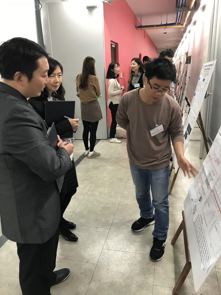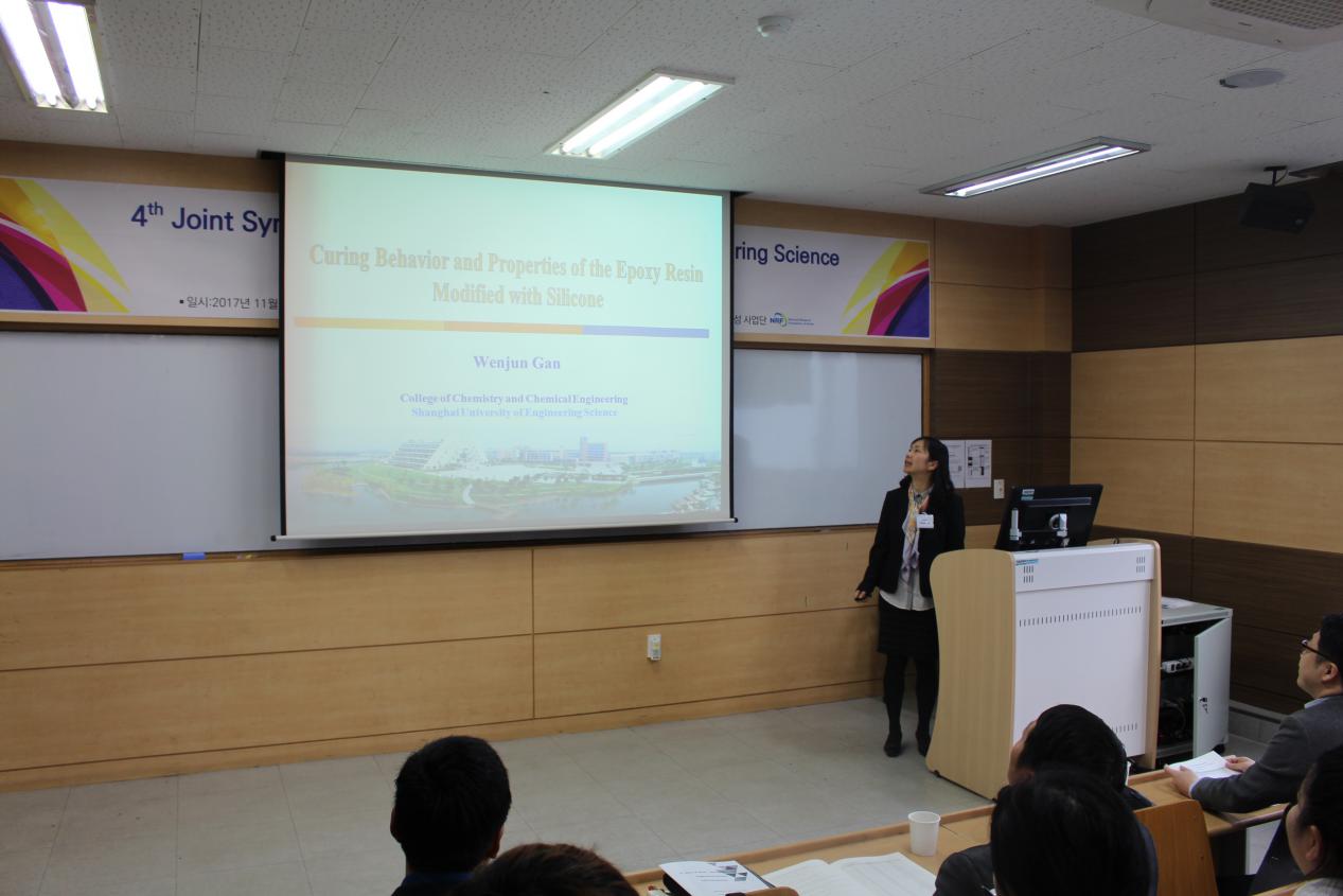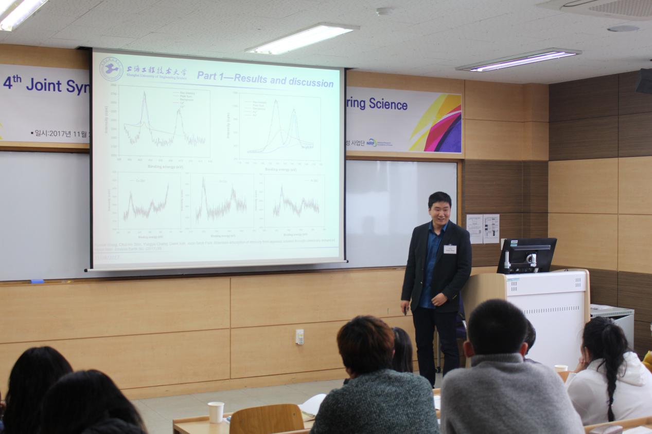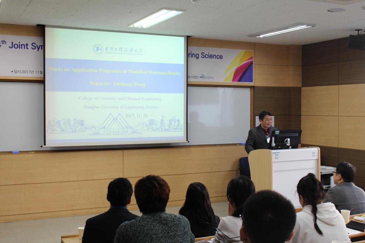 首先,Oh Eun Suok经理介绍了两校在人才培养、学术科研等方面取得的新成果。随后,公司王锦成教授、甘文君教授及王润锴老师分别做了题为“Study on Application Properties of Modified Montmorillonite”、“Curing Behavior and Structural Characterization of Epoxy Terminated Polysiloxane Blended with Diglycidyl Ether of Bisphenol-A”、“Removal of Mercury from Aqueous Solution Using Chemically Enhanced Kapok Fiber Functionalized with Dopamine(DOPA): Investigation of Bidentate Adsorption”的专题报告;蔚山大学化学与生物化学工程公司的师生代表先后介绍了各自的研究领域及取得的最新研究成果;双方就目前研究方向的共同性及今后将要开展学术交流与合作的领域进行了深入探讨。最后,中韩两校员工设计的学术墙报进行了展示与评比,公司员工王烨颖、何荣的作品获得优秀墙报奖。