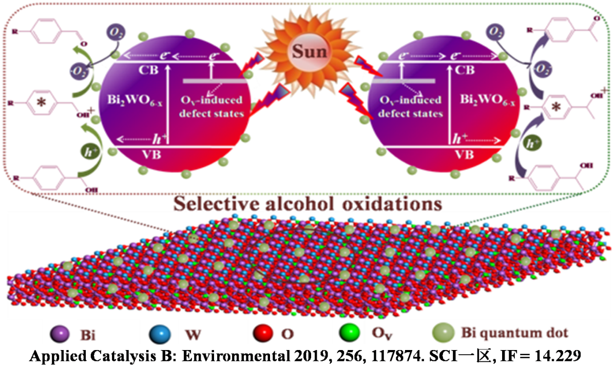 最近,该团队核心成员王金果副教授在光催化有机合成领域取得重要进展;基于前期研究工作基础(Applied Surface Science, 2018, 462, 760.SCI二区, IF = 5.155),通过水热技术结合原位还原技术,成功制备了金属Bi量子点与氧空位可控的Bi2WO6-x纳米片催化剂,并在水体系中实现了芳香醇光催化选择性绿色转化,解决了传统反应过程的环境毒化及污染问题;研究成果以“Bi2WO6-x nanosheets with tunable Bi quantum dots and oxygen vacancies for photocatalytic selective oxidation of alcohols”为题,发表在Elsevier顶级期刊Applied Catalysis B: Environmental 2019, 256, 117874。