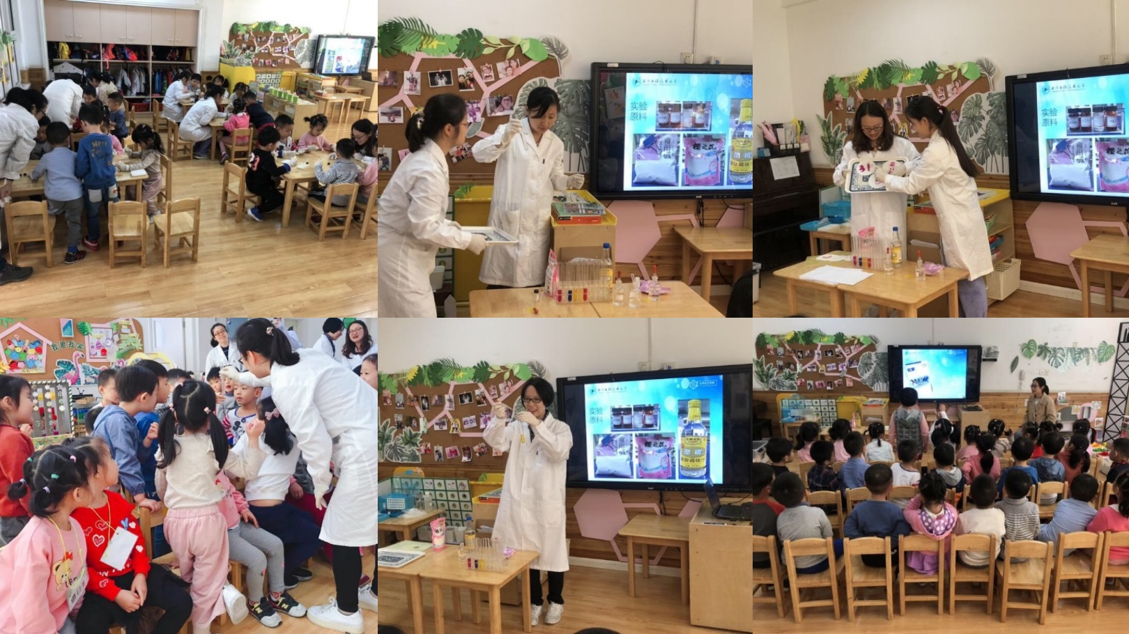 志愿服务当天,教工党支部书记万文亚老师通过故事导入的方式向小朋友讲解了与生活息息相关的化学知识,教工党员王金杰、万洁琼、郝宗娣、严丽丽、胡婷莛老师分别为小朋友演示了“食醋的色彩”、“变色的画纸”、“泡泡实验”和“捉迷藏”等四个有趣的实验。孩子们被有趣的实验现象和老师生动的讲述深深吸引并完全沉浸在科学的世界中。随后,每组幼儿都有一位老师进行指导和交流互动。教师党员们为小朋友带上专业手套,介绍实验过程,与小朋友一起做了有趣的PH试纸变色实验。