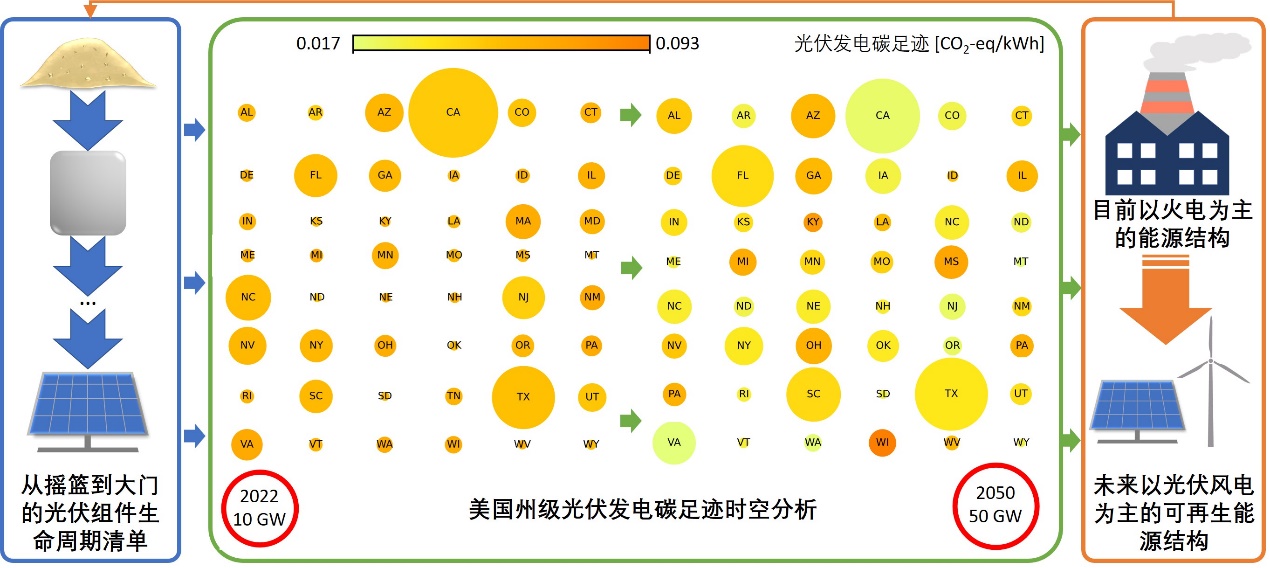 碳中和目标的实现是一项系统工程,需要全社会各行各业的参与,能源部门的脱碳是核心任务。风电光伏等可再生能源代替以煤炭为主的化石能源将是减少温室气体排放最重要实现路径。然而从生命周期的角度而言,光伏面板、风机、电池等可再生能源设备的生产过程也会造成大量的温室气体排放,其碳足迹并非为零,因此需要考虑不同时间和空间的差异,量化可再生能源设备全生命周期过程的环境足迹。中心发表在iScience的工作以美国为例,进行了动态生命周期建模,分析未来电网与光伏组件生产的协同脱碳效应,为我国未来以可再生能源为主的低碳电网建设提供全生命周期管理的理论基础。