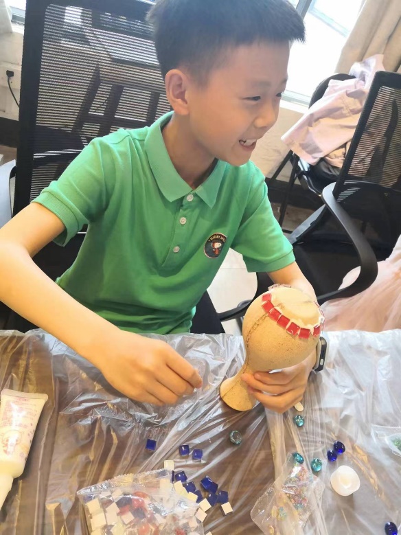 活动场面热闹非凡,首先,小朋友们都争先恐后地表达了自己的创作思路,接着,大家都迫不及待地付诸行动,涂胶水,铺马赛克,填缝,一环扣一环,个个都表现出色,做出了自己心目中最好看的图案。