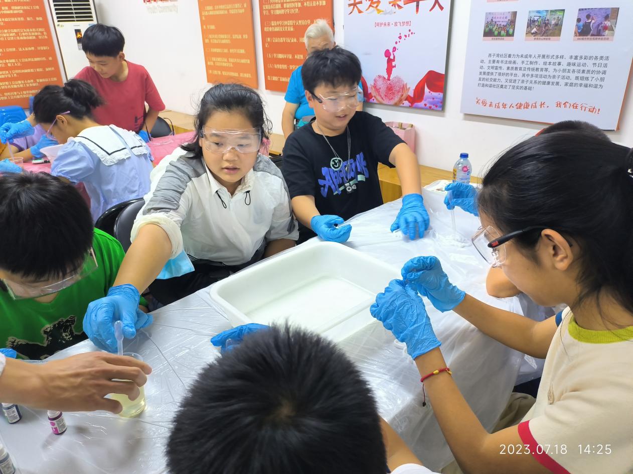 7月11日、18日、21日,威廉希尔官网高分子材料与工程专业教工党支部联合保利西子湾居委会和党支部开展了三期“探秘神奇化学,点燃科学梦想”活动,分别进行了自制变色指示剂、制作水精灵、彩虹雨等实验。