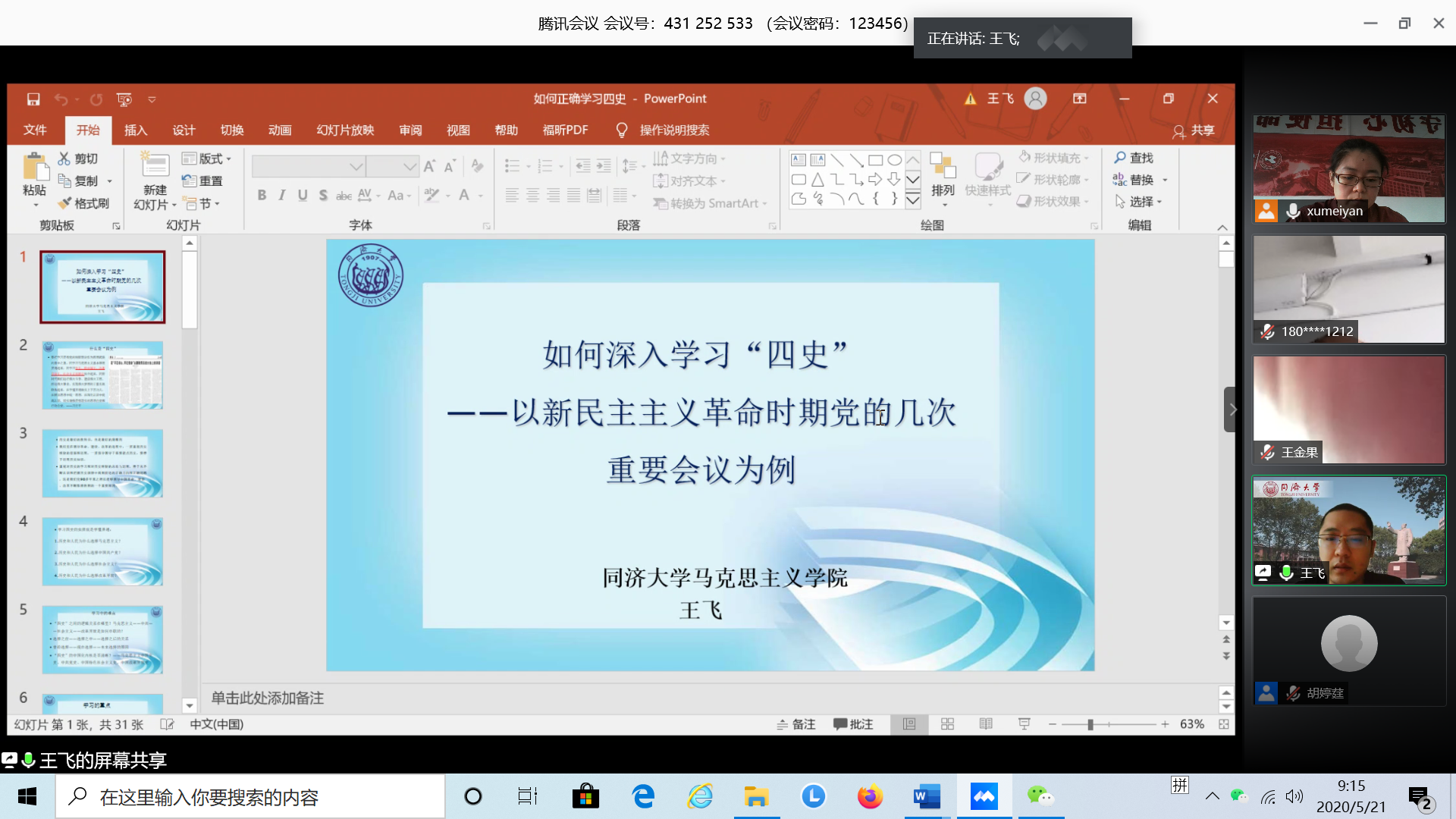 化学化工公司党委特邀中宣部马工程重点项目参与者,中宣部理论通俗读物编写人员,中央马工程教材辅导用书编写人员,全国马克思主义学科发展报告历史虚无主义分编撰写者,同济大学马克思主义公司王飞老师作了题为《如何深入学习“四史”》的专题报告。王老师以新民主主义革命时期党的几次重要会议,包括中共一大和二大、八七会议、遵义会议、六届六中全会和中共七大等为例,讲解了“四史”学习的重点、难点和学习方法,为党员们更有效地学习四史提供了一个新的学习角度和思考路径。同时,王老师在报告中,梳理分析了这几次会议对中国共产党发展历程的深刻影响,并对共产党人在革命过程中的革命热情、艰苦奋斗、与时俱进、勇于担当、自我革新的革命精神进行了深入解读,进一步加深了党员们对党的历史和优良传统的理解和铭记。